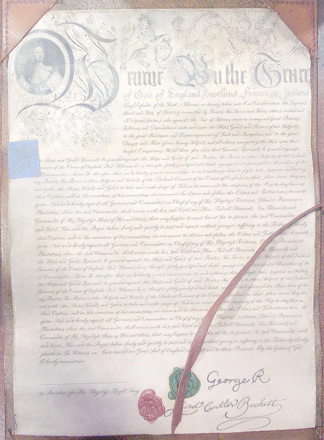 Links unter dem Text befindet sich eine Linie, auf der der Name des Inhabers eingetragen werden kann, darunter steht „as Privateer of His Majesty’s Royal Navy“ (als Freibeuter Seiner Majestät Königlicher Marine). Rechts daneben folgt mit grünem Siegellack das königliche Siegel und George R als Unterschrift, darunter mit rotem Siegellack das Siegel Becketts sowie dessen volle Unterschrift (Titel, Vor- und Zuname).