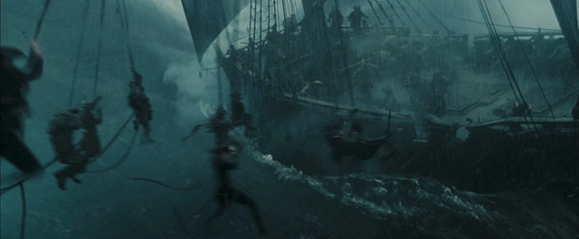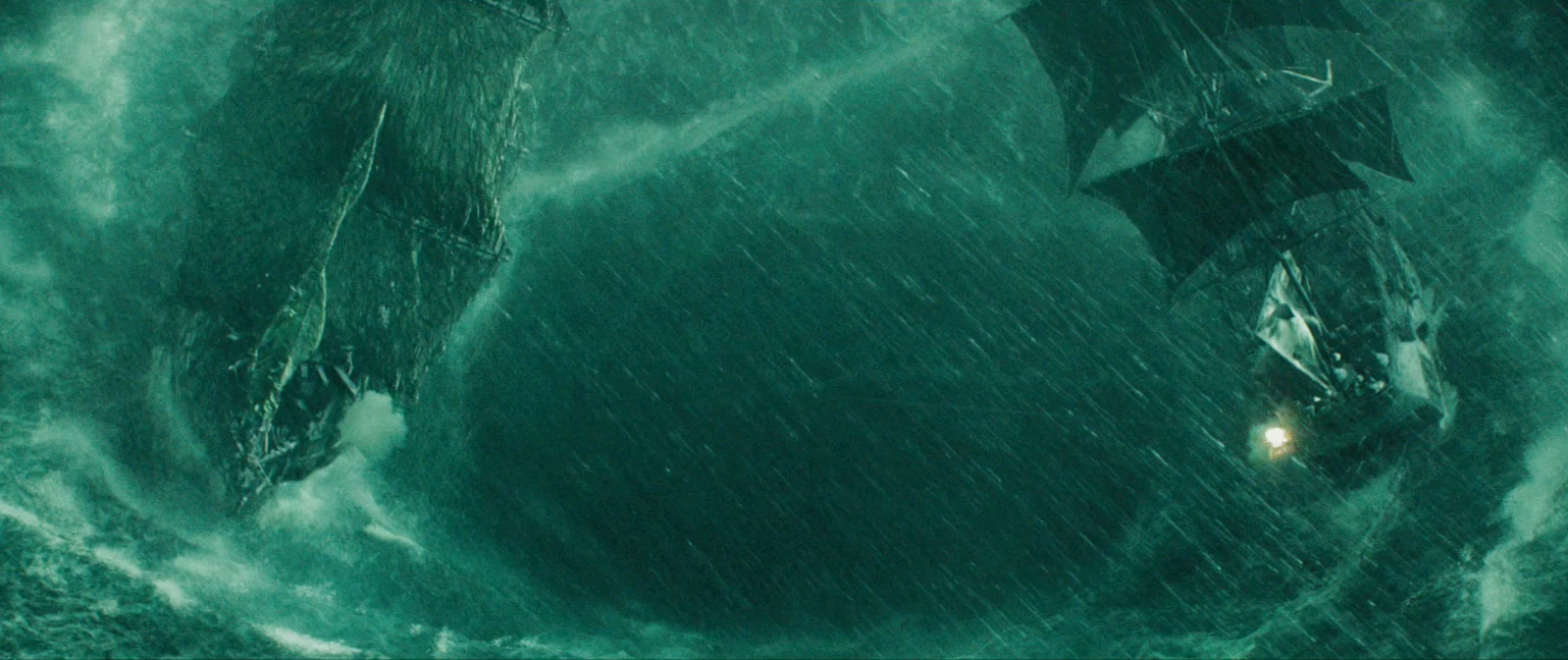 Die Black Pearl und die Flying Dutchman treffen in einem von Calypso erschaffenen Strudel aufeinander. Nach einem Feuergefecht, bei dem sich beide Schiffe immer näher kommen, schwingen sich Entermannschaften auf das jeweils andere Schiff.